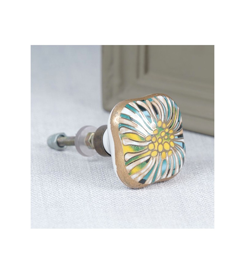 Son design floral aux accents jaune, turquoise et vert illumine vos tiroirs, armoires et commodes. Original et raffiné, il est parfait pour relooker un meuble ou personnaliser une décoration bohème, vintage ou contemporaine.