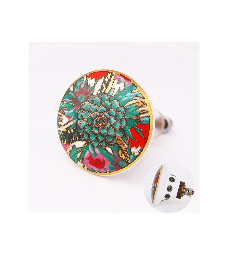 Offrez à vos meubles ce superbe bouton de meuble réalisé en porcelaine, peinte d'un motif floral dans les tons turquoise, bleu canard, rouge et rose avec une finition dorée. On aime le détail du motif floral présent sur le côté du bouton.
