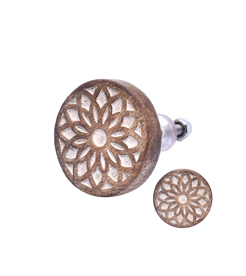 Réalisé à la main, ce bouton en bois clair présente un mandala contrasté blanc aux délicates lignes graphiques. Tout en douceur, il constitue une véritable source d'inspiration pour la décoration de votre intérieur.