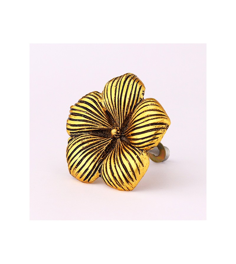 Sa forme florale délicatement sculptée dans de l'aluminium, inspirée de l’hibiscus, symbolise l’exotisme et l’élégance. Le fini doré vieilli relevé de subtils traits noirs crée un contraste raffiné qui attire l’œil et apporte du relief à vos façades de tiroirs et de portes.