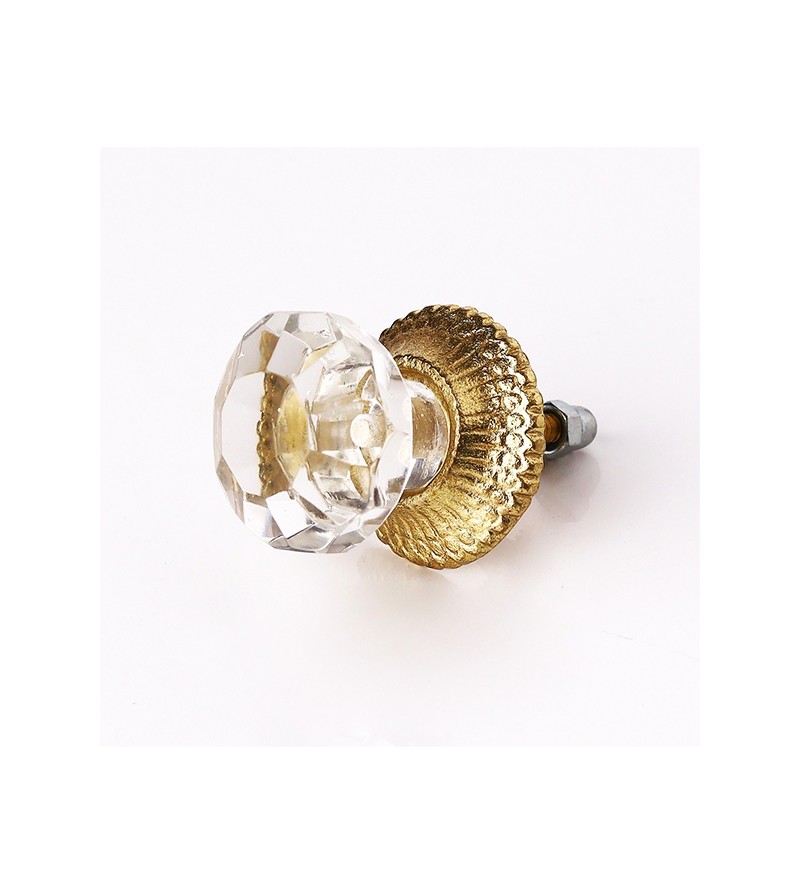 Ce bouton de meuble en verre octogonal joue la carte du charme ancien avec sa forme taillée façon cristal et sa base dorée finement travaillée.